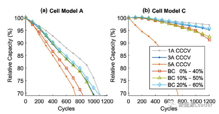 下圖為電池A和C采用BC充電策略的循環性能,從圖中能夠看到對于電池A,如果從0%開始采用加速充電(5A)則會導致電池的衰降速度顯著增加,與5A電流的CCCV充電策略接近。而如果從10%SoC和20%開始加速充電,則循環壽命會大大改善,與3A電流的CCCV充電策略接近。而對于電池C,如果開始加速充電的SoC為0%和10%則會導致電池的衰降速度明顯加速,而如果在20%SoC開始加速充電,則對于電池的循環壽命的影響較小。這也表明在較低的SoC下進行加速充電會導致電池的循環壽命受到顯著的影響。